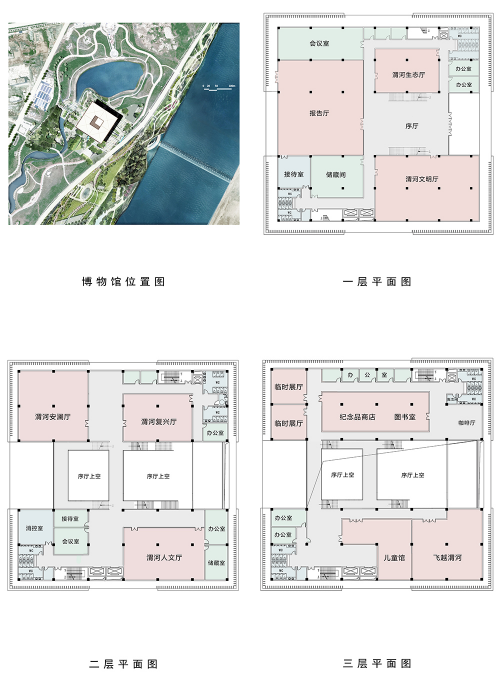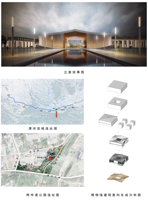 建筑矗立在渭河河畔,倒映在馆前的景观水面,立面采取简约的现代主义造型,各个立面屋檐呈“人”字,寓意人类与渭河和谐共生。屋顶造型为传统建筑的抽象化,采取几何曲面,呈波浪形,寓意渭河文明在波澜壮阔的历史长河中璀璨发光。