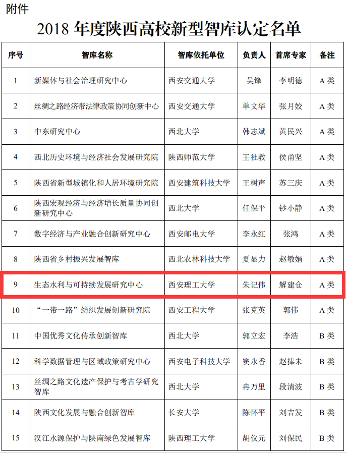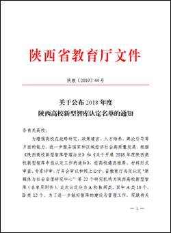 2019年2月21日,陕西省教育厅下发了《关于公布2018年度陕西高校新型智库认定名单的通知》(陕教〔2019〕44号),课题组申报的“生态水利 与可持续发展研究中心”被认定为陕西首批高校新型智库(A类),依托建设单位为西安理工大学。