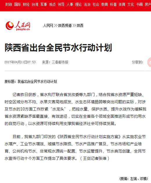 2017年4月,陕西省水利厅联合省发改委等九部门印发了《陕西省全民节水行动计划实施方案》。