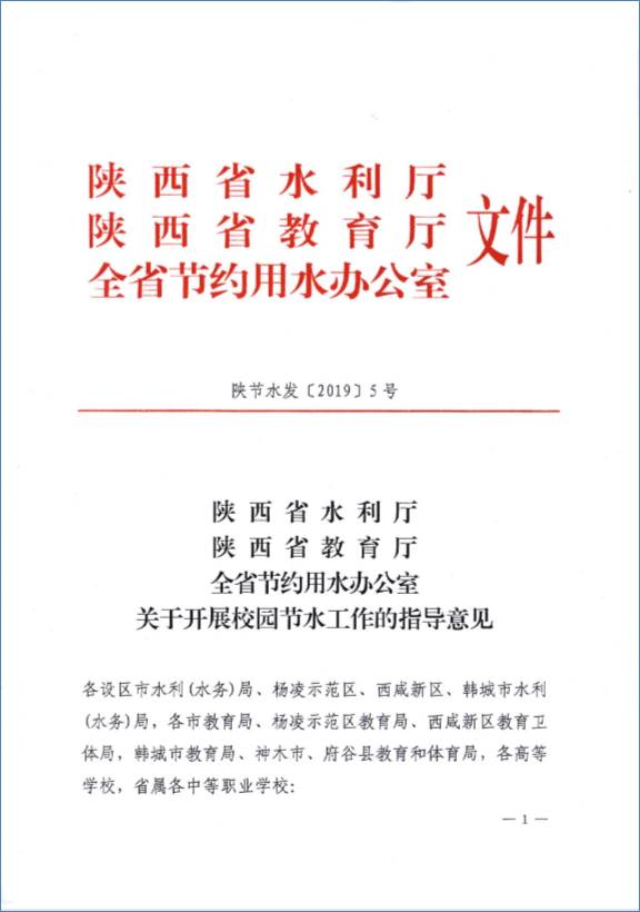 2019年1月,智库起草了《关于推进全省校园节水工作的实施意见》(以下简称意见),提出以“校园节水 陕西行动”为主题推进全省校园节水工作,建设节水型校园,提高用水效率和效益,引导广大青少年学生节约用水,辐射带动家庭及全社会节约用水,就推进全省各级各类学校校园节水工作。建议被陕西省节约用水办公室采纳应用,并以建议为主要内容于2019年7月12日印发出台了《关于开展全省校园节水工作的指导意见》(陕节水发〔2019〕5号),有效推进了陕西省校园节水工作。